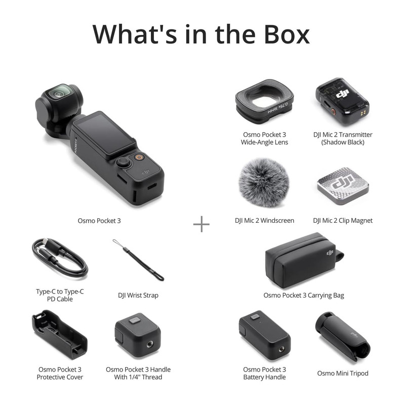 شامل مجموعه شروع اسمو پاکت 3، فرستنده DJI Mic 2، دسته باتری، ترایپاد کوچک Osmo، و ... (ادامه ندارد، متن مختصری از ملحقات آمده است). شارژر باتری به صورت جداگانه فروخته میشود. توصیه میشود که شارژر DJI 30W USB-C را خریداری کنید.