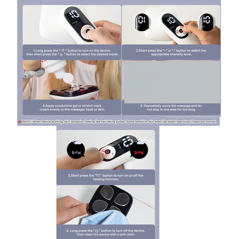 استفاده کامل بدن : این ماساژور سلولیت برای اکثر قسمت های بدن از جمله شکم، کمر، باسن، بازوها، پاها و پشت مناسب است. (توجه: روی صورت استفاده نشود.) توصیه می شود هفته ای 2 تا 3 بار و هر بار 15 دقیقه استفاده شود (توجه: اگر می خواهید به کار ادامه دهید، باید دستگاه را به طور مداوم روشن کنید تا 6 هفته دوباره نتایج را مشاهده کنید).
