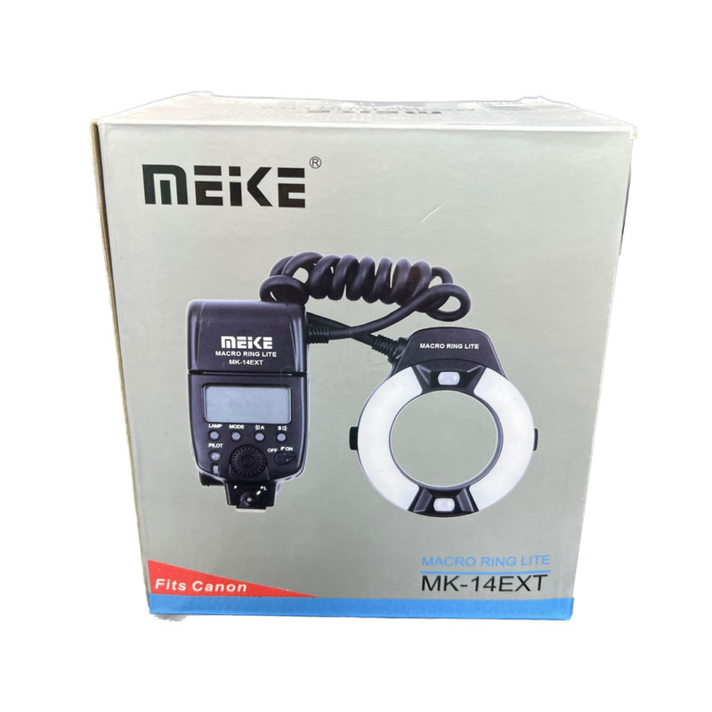 رینگ فلاش مدل میک Meike MK-14EXT سازگار با دوربین کانن ، فلاشی ایده آل برای کارهای نزدیک (ماکرو) و همچنین عکسهای پرتره خلاقانه ، رینگ فلاش ماکرو MK-14EXT TTL مخصوص Canon از کمپانی Meike سازگار با Canon E-TTL / E-TTL II طراحی شده است. با دامنه کار 5 سانتی متر تا 20 سانتی متر ، دارای زمان بازیابی با چهار باتری قلمی (که به صورت جداگانه خریداری شده) از 0.1 تا 5 ثانیه است که به شما امکان زدن 100 تا 800 فلاش ، به همراه حلقه های آداپتور 40.5 ، 52 ، 55 ، 58 ، 62 ، 67 ، 72 و 77 میلی متربه همراه کیف حمل چرم برای نگه داری و حمل و نقل در نظر گرفته شده است.
