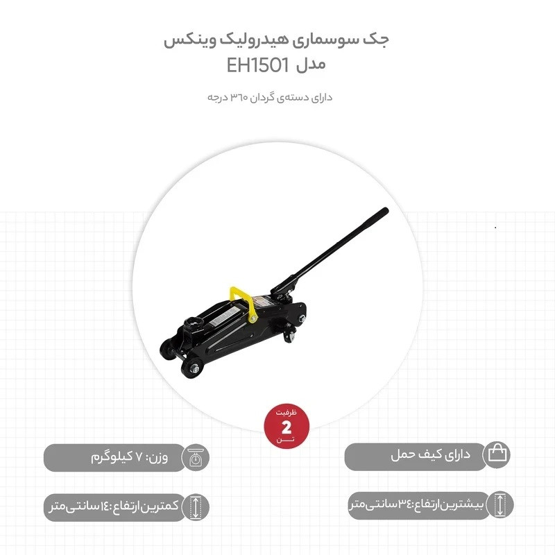 | سایر توضیحات | - جک سوسماری 2 تن وینکس - دارای کیف حمل - دارای چرخ - دارای دستهی گردان ۳۶۰ درجه - ابعاد بستهبندی: طول: ۴۵، عرض: ۱۹.۵، ارتفاع: ۱۴ سانتیمتر - وزن بستهبندی: ۸.۵ کیلوگرم - حداکثر ظرفیت : ۲ تن |