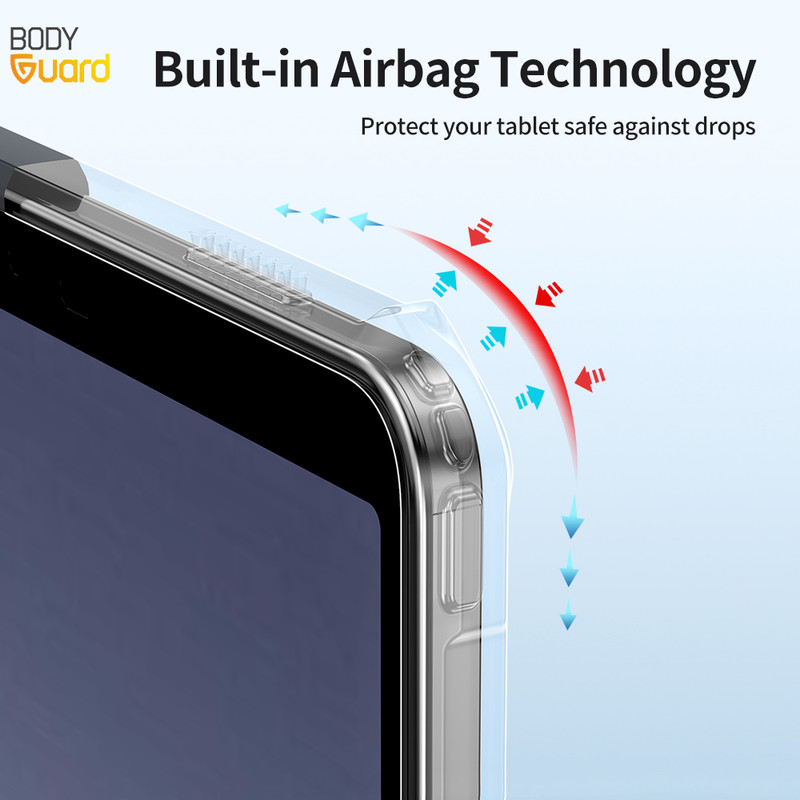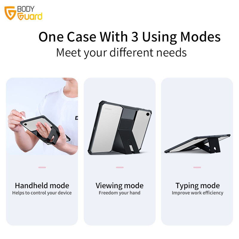 قاب بادیگارد مدل KickStand با بهره گیری از جدیدترین طراحی روز علاوه بر زیبایی امکان محافظت کامل از تبلت را نیز فراهم می کند. این کاور دارای کناره محکم و گوشه های کپسولی جهت حفاظت از تبلت در برابر صدمات می باشد. پشت این کاور طلق محکم شفاف می باشد که باعث حفظ زیبایی تبلت می شود. کاور KickStand دارای قسمت استند در پشت می باشد که باعث می شود تبلت در 3 حالت تماشای فیلم، حالت تایپ و حالت دستگیره ای جهت قرار گرفتن در کف قرار گیرد.