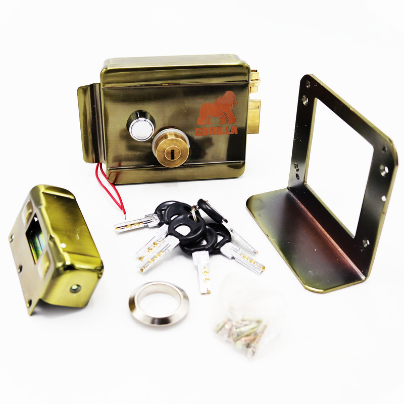 | سایر توضیحات | - قفل برقی مدل گوریلا - دارای سیلندر برنجی با دکمه فشاری (بدون زنجیر) - بدنه قفل ضد آب - دارای محافظ باران - امنیت فوق العاده بالا - دارای زبانه و قفل برنجی - دارای 6 کلید برنجی مستحکم - قطعات با روکش آبکاری شده ، رنگ مخصوص و ضد زنگ - دارای 13 پیچ برای نصب قفل - دارای 2 سیم نیم متری متصل برای ورود جریان برق |