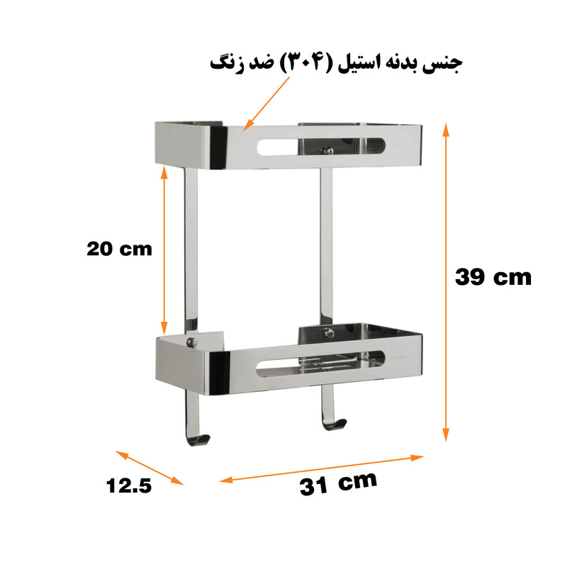 طبقه حمام مدل «KH-V-2-G» با برند «دلفین» (DOLPHIN) محصولی کاملا ایرانی است. معمولا یکی از مشکلاتی که در محیط های رطوبتی مثل حمام و دستشویی با آن مواجه هستیم زنگ زدگی و تجمع آب زیر و روی لوازم است. طبقه حمامی دلفین با استفاده از متریال استیل ضد زنگ و همچنین مشبک بودن سطح نگهدارنده برای خروج آب این مشکل را رفع نموده است. جای لیف در قسمت بیرونی اجازه گردش هوا و در نتیجه جلوگیری از تجمع باکتری را ممکن ساخته است. ظاهری زیبا ،نصب آسان وفضای زیاد برای قرار دادن شوینده ها و لوازم اصلاح از ویژگی های این محصول است. شستشو و قرار دادن این طبقه کنار دوش به واسطه جنس ضد زنگ آن نظافت لوازم را ساده تر کرده است. این محصول به فورم های 2 طبقه، 3طبقه و در رنگ های کروم و طلا ارایه شده و متریال تمام رنگ ها استیل است.