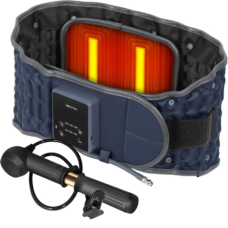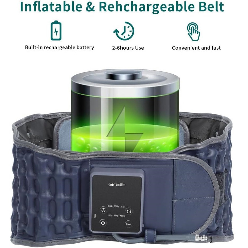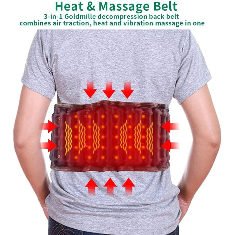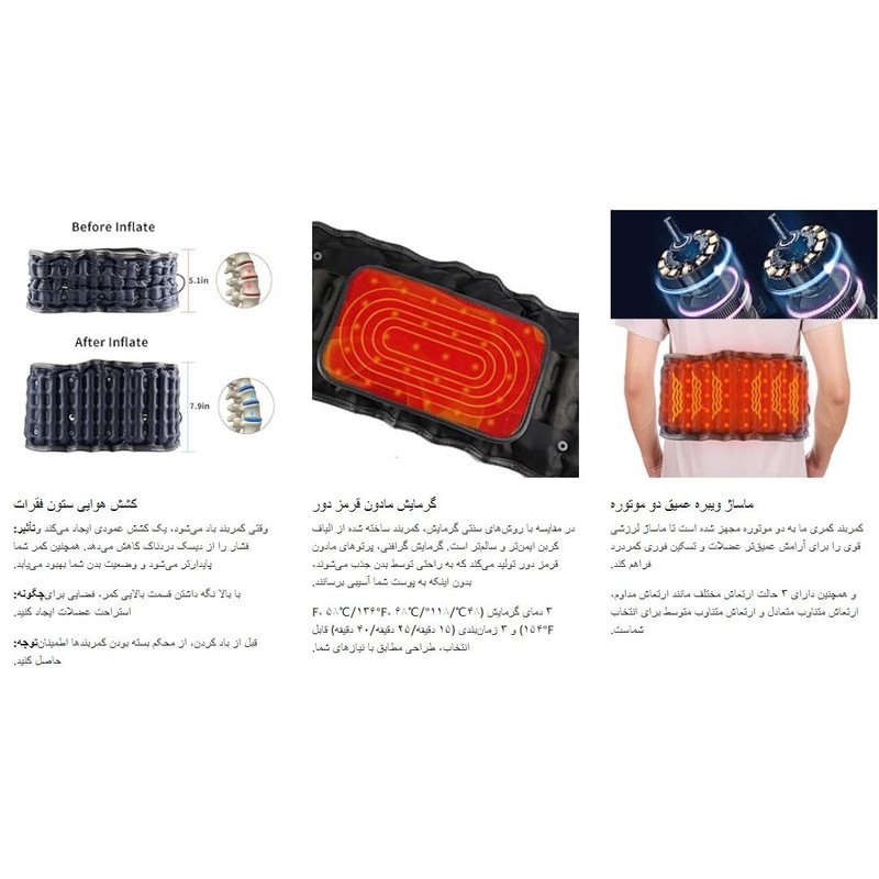 | سایر توضیحات | کمربند ماساژور کمر گرم شونده بادی برای تسکین فوری کمردرد، کمربند رفع فشار کمر با گرمایش و ویبره، با باتری قابل شارژ، مناسب برای کمر 29-49 راه حل عالی برای کمردرد :کمربند رفع فشار سه کاره گلدمیل که ترکیبی از کشش هوا، گرما درمانی و ماساژ ارتعاشی است، به طور ویژه برای تسکین مشکلات کمر شما طراحی شده است. شما میتوانید فوراً کمردرد را در خانه و بدون هیچ گونه ریسک، درمانهای فیزیکی گران قیمت یا دارو تسکین دهید. باتری قابل شارژ با ظرفیت بالا، بسته به حالت کار، میتواند به مدت ۱۳۰ تا ۴۱۰ دقیقه استفاده شود. ماساژ ویبره قدرتمند : ماساژ ویبره دو موتوره، باعث شل شدن عمیق فاسیای عضلات، رفع خستگی، کاهش مؤثر سفتی و درد عضلات، بهبود گردش خون، حفظ سلامتی و کمک مؤثر به کاهش درد کمر میشود. سه حالت ویبره برای انتخاب وجود دارد که متناسب با نیازهای مختلف هر فرد قابل تنظیم است. درمان با گرما با مادون قرمز :پدهای گرمایشی ساخته شده از الیاف کربن، گرمادرمانی ایمن و سریعی را ارائه میدهند. بین ۳ دمای گرما (۴۸ درجه سانتیگراد/۱۱۸ درجه فارنهایت، ۵۸ درجه سانتیگراد/۱۳۶ درجه فارنهایت، ۶۸ درجه سانتیگراد/۱۵۴ درجه فارنهایت) یکی را انتخاب کنید و تا ۳ زمان گرمایش (۱۵ دقیقه/۲۵ دقیقه/۴۰ دقیقه) تنظیم کنید. گرمای تسکیندهندهای را برای کمک به تسکین بیشتر درد عضلانی و بهبود گردش خون فراهم میکند. کشش هوایی ستون فقرات : این کمربند با کشش هوایی ستون فقرات قادر است قسمت بالای بدن شما را بلند کند و وزن را از روی کمر شما بردارد و همچنین عضلات شما را شل کند. با کشش، بار روی رباط کاهش مییابد و به حلقه فیبری آسیب دیده کمر اجازه استراحت میدهد. ایدهآل برای افرادی که از کمردرد کمری، درد عصب سیاتیک، آرتروز و سایر انواع کمردرد رنج میبرند. مناسب برای همه :طراحی ارگونومیک یونیسکس و بند قابل تنظیم با پد افزایش طول میتواند بین ۲۹ تا ۴۹ اینچ روی کمر اکثر افراد جا شود. کمربند کمری سه کاره گلدمیل با قابلیت رفع فشار و ماساژ ویبره دارد . در دنیا ، تقریباً ۵۰٪ از مردم هر ساله از کمردرد رنج میبرند و این منجر به این میشود که کمردرد یکی از شایعترین دلایل مراقبتهای بهداشتی باشد. کمردرد میتواند نه تنها از نظر هزینهها، بلکه از نظر از دست دادن دستمزد به دلیل غیبت از کار و کاهش بهرهوری نیز برای افراد هزینه داشته باشد. یکی از راههای کاهش کمردرد، استفاده از کمربند ماساژور کمر بادی است. کمربند ماساژور کمر گلدمیل به گونهای طراحی شده است که فشار اضافی روی ستون فقرات را کاهش میدهد، به تقویت ستون فقرات کمک میکند، درد کمر را تسکین میدهد و فشار شکمی را افزایش میدهد. چرا کمربند ضد کمر گلدمیل را انتخاب کنیم؟ کمربند کمری سه کاره گلدمیل، با ترکیب کشش، ماساژ و گرما، بر اساس کاهش درد کمر از طریق رفع فشار، انواع مشکلات کمر را تسکین میدهد که روشی عالی برای تسکین خفیف کمردرد است! کمربند طبی بادی با قابلیت گرم کردن و ماساژ :مسائلی که حل میکنیم ، تسکین فوری کمردرد ،تسکین درد عضلات ، عضلات مرکزی و پشت خود را تقویت کنید ، رفع فشار از ستون فقرات برای بازگرداندن دیسک به حالت عادی ، گردش خون را تقویت کنید ، کمرتان را گرم نگه دارید. کمربند ماساژور کمر بادی گرم شونده کمربند ضد کمر درد چیست؟ کمربند رفع فشار گلدمیل ۳ در ۱، یک کمربند کششی بادی است که میتواند به طور مؤثر کمردرد را کاهش دهد و به عنوان ابزار انتخابی برای تسکین کمردرد به طور گسترده مورد استفاده قرار میگیرد. جدیدترین کمربند ارتقا یافته، ترکیبی از کشش هوا، گرما و ماساژ ارتعاشی است که به راحتی قابل اجرا و فوقالعاده مؤثر است. ماساژ ویبره عمیق دو موتوره کمربند کمری ما به دو موتوره مجهز شده است تا ماساژ لرزشی قوی را برای آرامش عمیقتر عضلات و تسکین فوری کمردرد فراهم کند. و همچنین دارای ۳ حالت ارتعاش مختلف مانند ارتعاش مداوم، ارتعاش متناوب متعادل و ارتعاش متناوب متوسط برای انتخاب شماست. گرمایش مادون قرمز دور در مقایسه با روشهای
