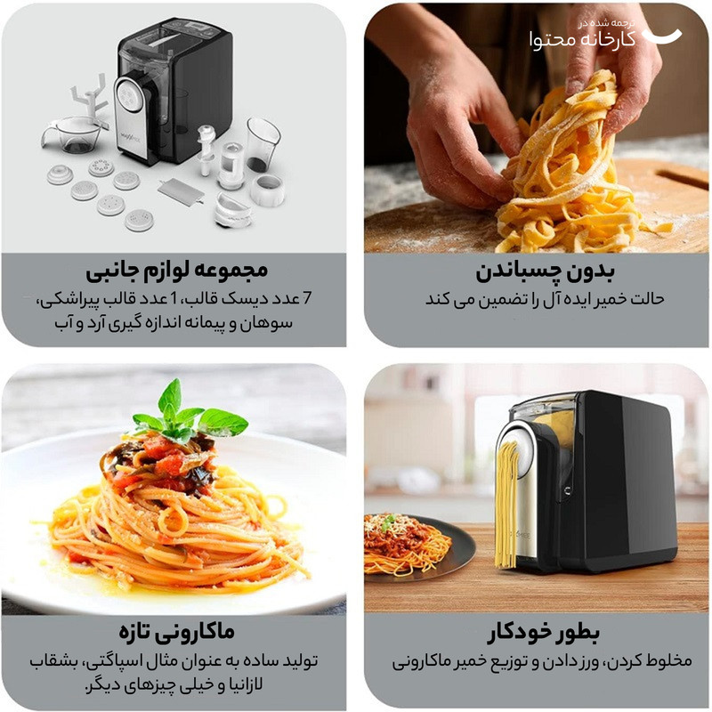 | سایر توضیحات | با دستگاه ماکارونی Maxxmee می توان به راحتی و به سرعت ماکارونی تازه را تهیه کرد. این دستگاه مبتکرانه پاستا به صورت خودکار کار می کند و نتایج مطلوب و خوشمزه ای را ارائه می دهد. مخلوط کردن و توزیع خمیر به صورت خودکار است - به راحتی از طریق کنترل پنل دیجیتال قابل تنظیم است. ترکیبی از فشار بالا و دیسک های شکل خاص به پاستا قوام مطلوبx را در هفت نوع مختلف می دهد: اسپاگتی، پنه، لازانیا، موی فرشته، تالیاتل، پاپاردل و فتوچین. افزودن عصاره سبزیجات یا ادویه جات نیز طعم ها و رنگ های مختلفی را برای تولیدات ماکارونی شما امکان پذیر می کند. مناسب برای تولید آسان ماکارونی تازه، به عنوان مثال برای اسپاگتی، لینگوئین، بشقاب لازانیا و خیلی چیزهای دیگر. مخلوط کردن، ورز دادن و پخش خودکار خمیر ماکارونی شامل 7 دیسک قالب گیری، 1 قالب پیراشکی، سوهان و پیمانه اندازه گیری آرد و آب تمیز کردن آسان - تمام قطعات قابل جابجایی قابل شستشو در ماشین ظرفشویی هستند کنترل پنل دیجیتال و عملکرد شمارش معکوس برای فتوچین/لازانیا/لینگوین/نودل/پاپاردل/پنه/اسپاگتی/تالیاتل تجهیزات: ملحقات / فنجان های اندازه گیری / لیسه ها حالت کار: برقی کنترل پنل دیجیتال و عملکرد شمارش معکوس، مخلوط کردن خودکار، ورز دادن و پخش خمیر ماکارونی تمیز کردن آسان - تمام قطعات قابل جدا شدن قابل شستشو در ماشین ظرفشویی هستند |