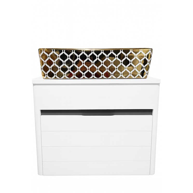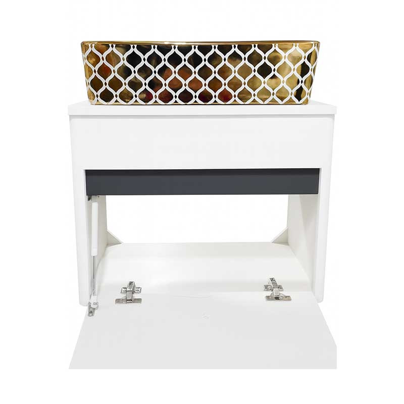 ابعاد کابین: 40*60، ابعاد سنگ روشویی : 40*50، ارتفاع : 55 سانت جنس کابینت : تمام پی وی سی ضدآب . مناسب حمام و سرویس بهداشتی می باشد. کابین دارای جک نگهدارنده و لولای ضدزنگ می باشد. سنگ چینی بهداشتی برند معتبر چینی کرد می باشد که با لعاب آنتی باکتریال و و رنگ سفید طلایی می باشد که زیبایی و جلوه خاصی دارد.