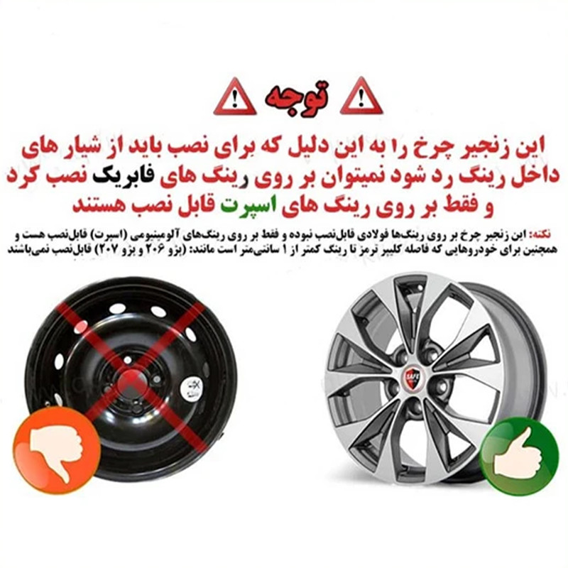 | سایر توضیحات | wheel diameter 17-20 inch - مناسب برای رینگ های اسپرت -افزایش چسبندگی لاستیک به جاده-طراحی بادوام-نصب سریع و آسان-بهبود کنترل فرمان و جلوگیری از لغزش-قابل استفاده در جادههای شهری و برونشهری |